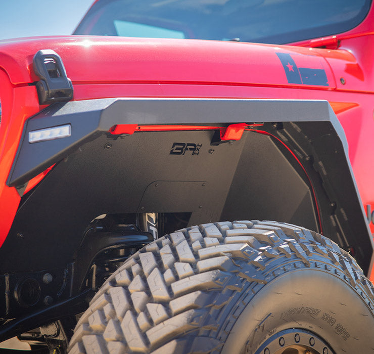 The Jeep Wrangler and Gladiator front fender liners have a two-stage black powder coat with a light textured finish. They are designed to work with Body Armor 4x4's Fender Flares and help protect your engine bay from mud and debris.
