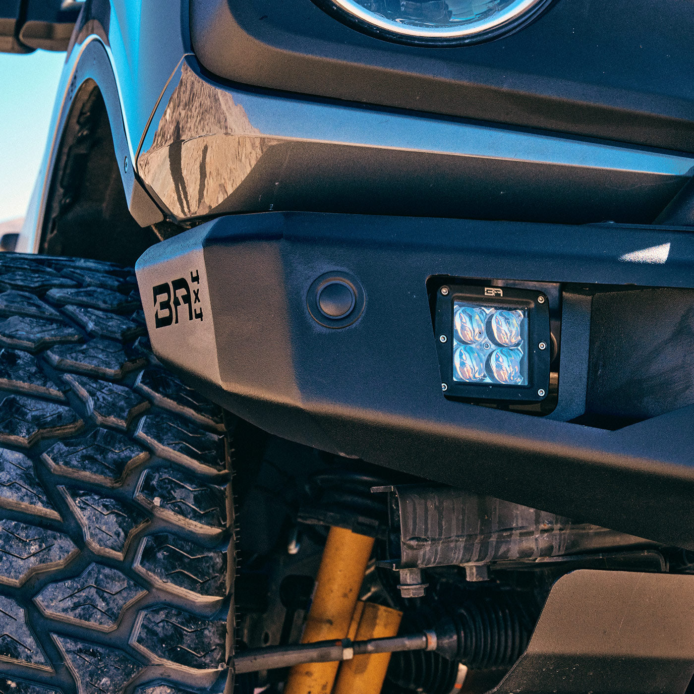 The Odyssey Series front and rear bumpers offer versatile light fitment options to enhance visibility on the road. The front can accommodate an 18" single row or 20" double row LED bar, while the front and rear bumper can accommodate and additional two cube LEDs, providing ample illumination for safe driving in any conditions.