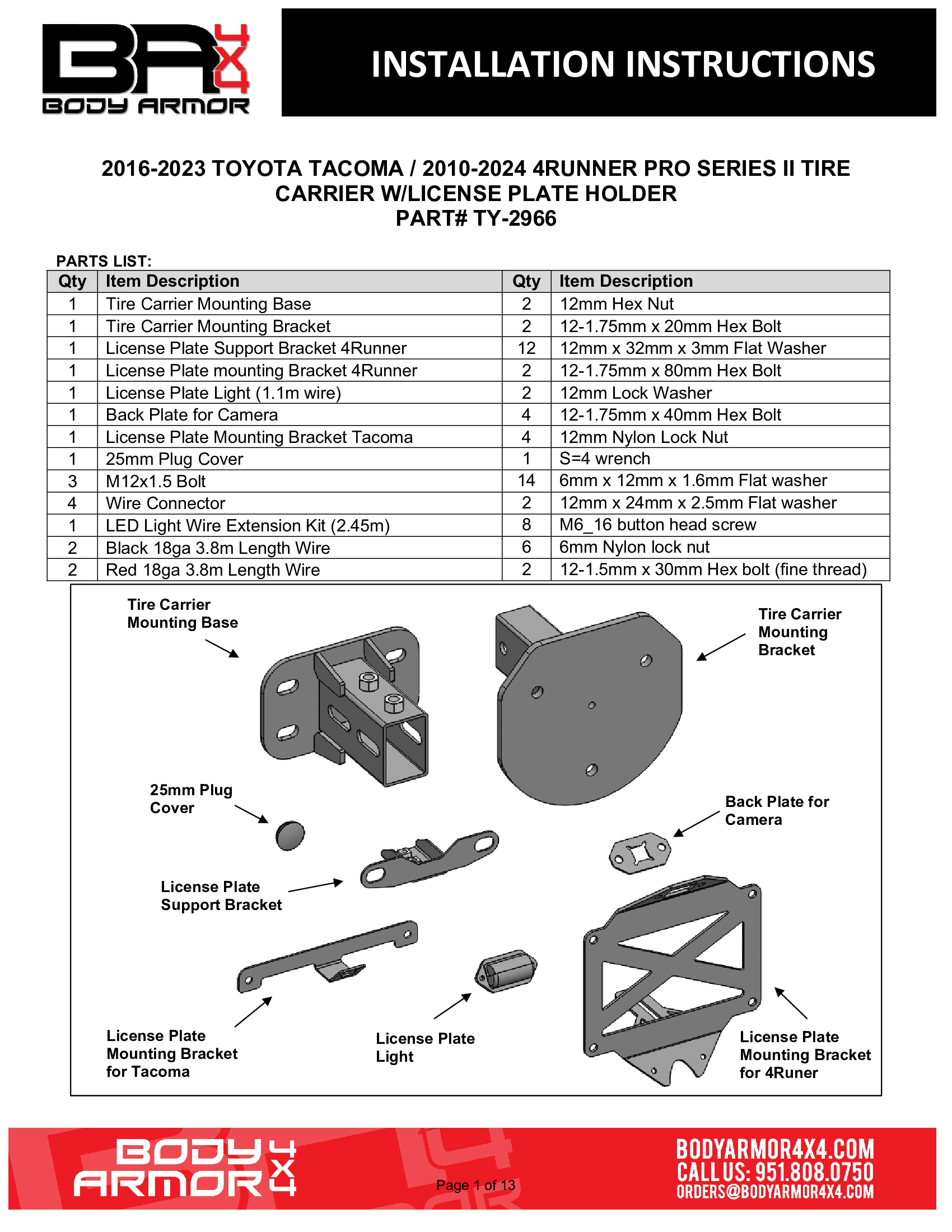 2016-2023 TOYOTA TACOMA/2010-2024 4RUNNER PRO SERIES II TIRE CARRIER W/LICENSE PLATE HOLDER